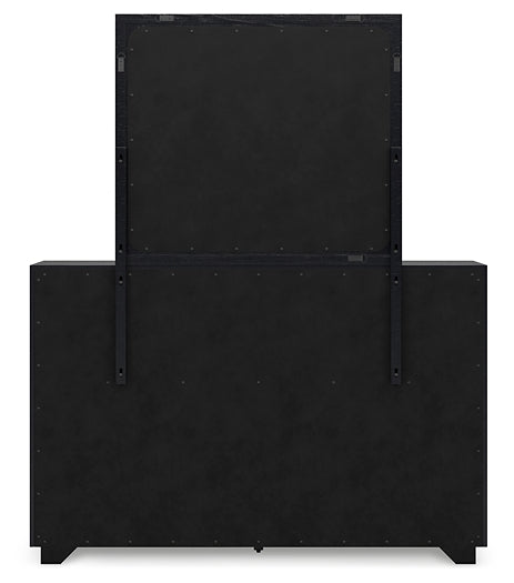 Details | B768B4: Includes headboard, footboard and rails, Made with pine solids, veneers and engineered wood substrate, Textured black wood stain with waxy topcoat, Extra wide rails for a bench-like wrap around, Foundation/box spring required, sold separately, Mattress available, sold separately, Assembly required, B768B1: Includes dresser and mirror, Made with pine solids, veneers and engineered wood substrate, Textured black wood stain with waxy topcoat, Hardware-less design, 6 drawers with fully finished interiors, dovetail construction and ball-bearing side glides (top drawers felt lined), Mirror attaches to back of dresser, | |