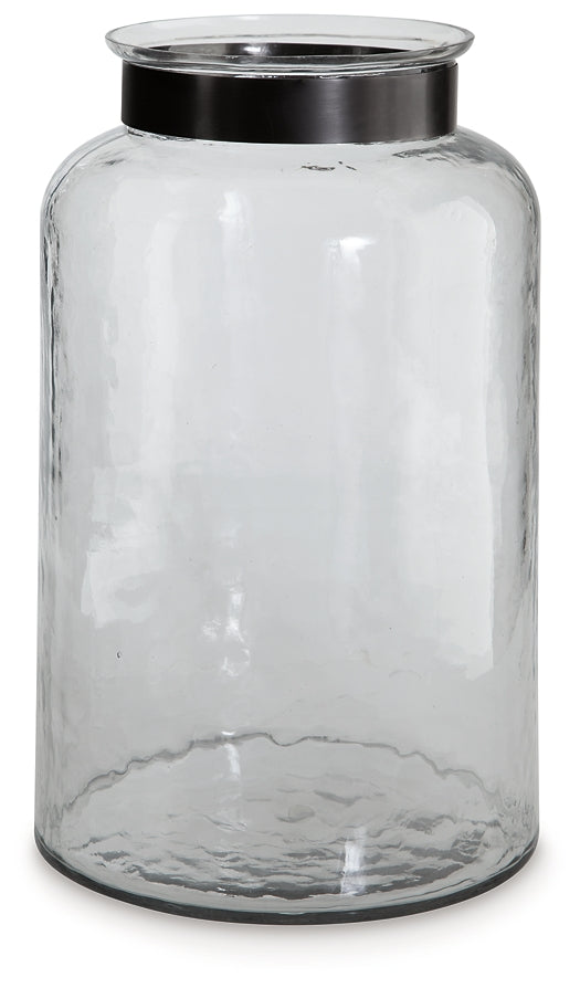 Details | Made of clear glass with hammered effect, Antiqued pewter-tone metal accent, Not watertight; suitable for faux/dried florals and greenery only | |