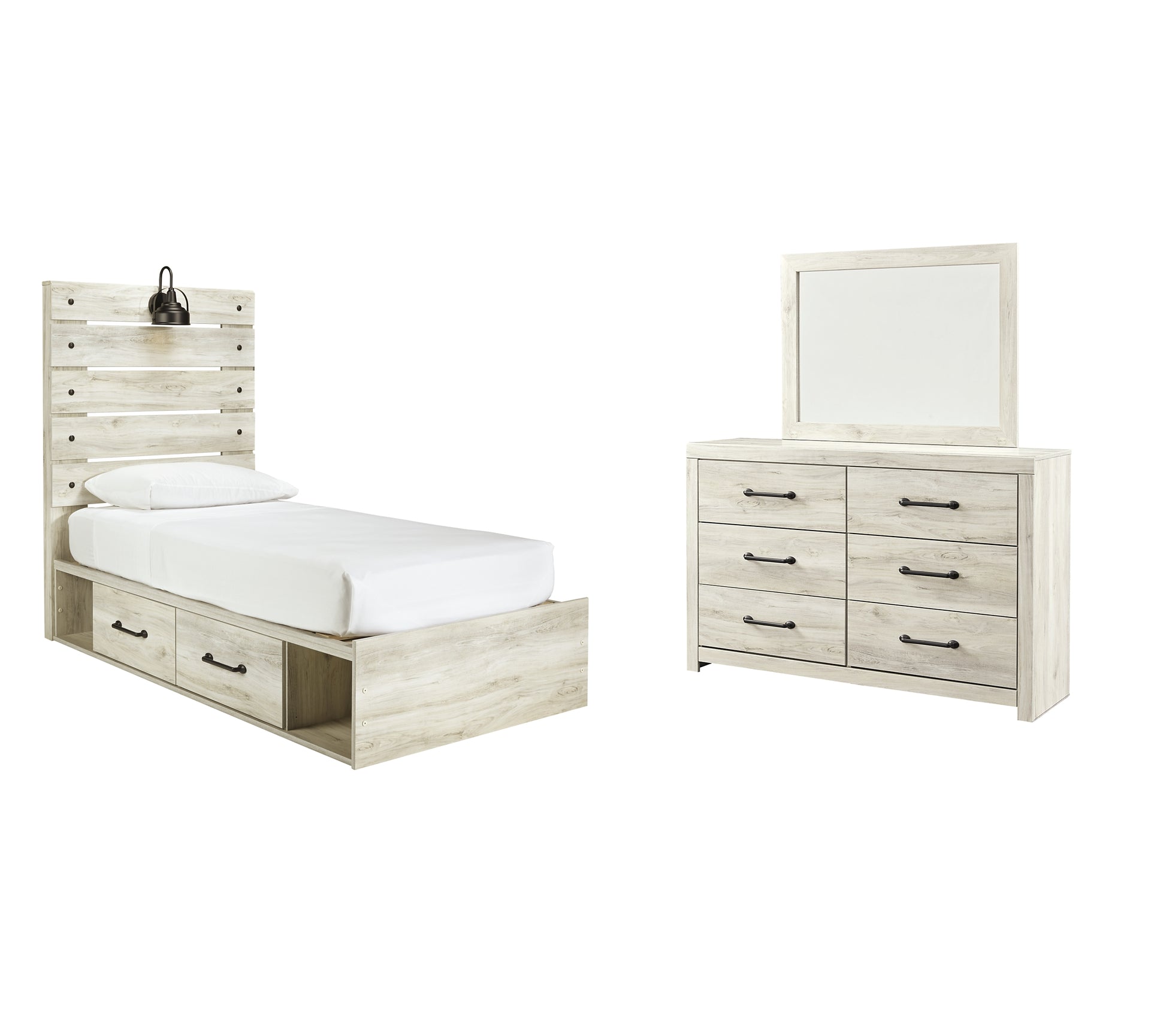 Details | B192B1: Includes dresser with mirror, Made of engineered wood (MDF/particleboard) and decorative laminate, Wispy white finish over replicated oak grain with authentic touch, 6 smooth-gliding drawers, Drawer interiors are lined with a faux linen laminate for a clean, finished look, Large-scale hardware with dark finish, Mirror attaches to back of dresser, Assembly required, B192B17: Includes headboard, footboard, side storage, rail and slats, Made of engineered wood (MDF/particleboard) and decorative laminate, Wispy white finish over replicated oak grain with authentic touch, Large-scale hardware with dark finish, 2 decorative sconce lights, LED with 3 AA batteries, 2 smooth-gliding storage drawers, 2 storage cubbies, 2 slim-profile USB charging ports, Power cord included; UL-listed, Bed does not require additional foundation/box spring; accommodates most zero clearance adjustable bases with the addition of a bunkie board, Mattress available, sold separately, Assembly required, | |
